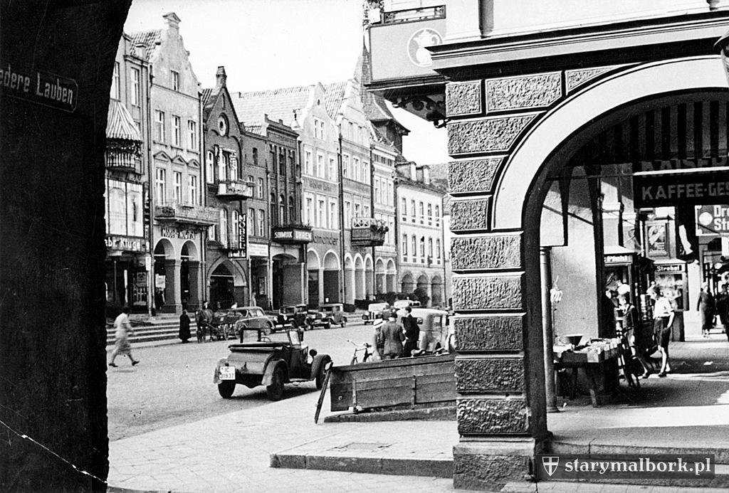 Otóż, co ciekawe wina nie do końca leży po stronie polskich powojennych architektów, chociaż ja osobiście dałbym im 90% zasług w tej materii. Otóż prekursorem obecnej przybudówki była przedwojenna kamienica, która bezpośrednio była połączona z budynkiem Ratusza. Stare Miasto w Malborku zostało w dużym stopniu zniszczone w czasie oblężenia w 1945 roku i po wojnie ruiny zostały rozebrane. A wyglądało to mniej więcej tak: